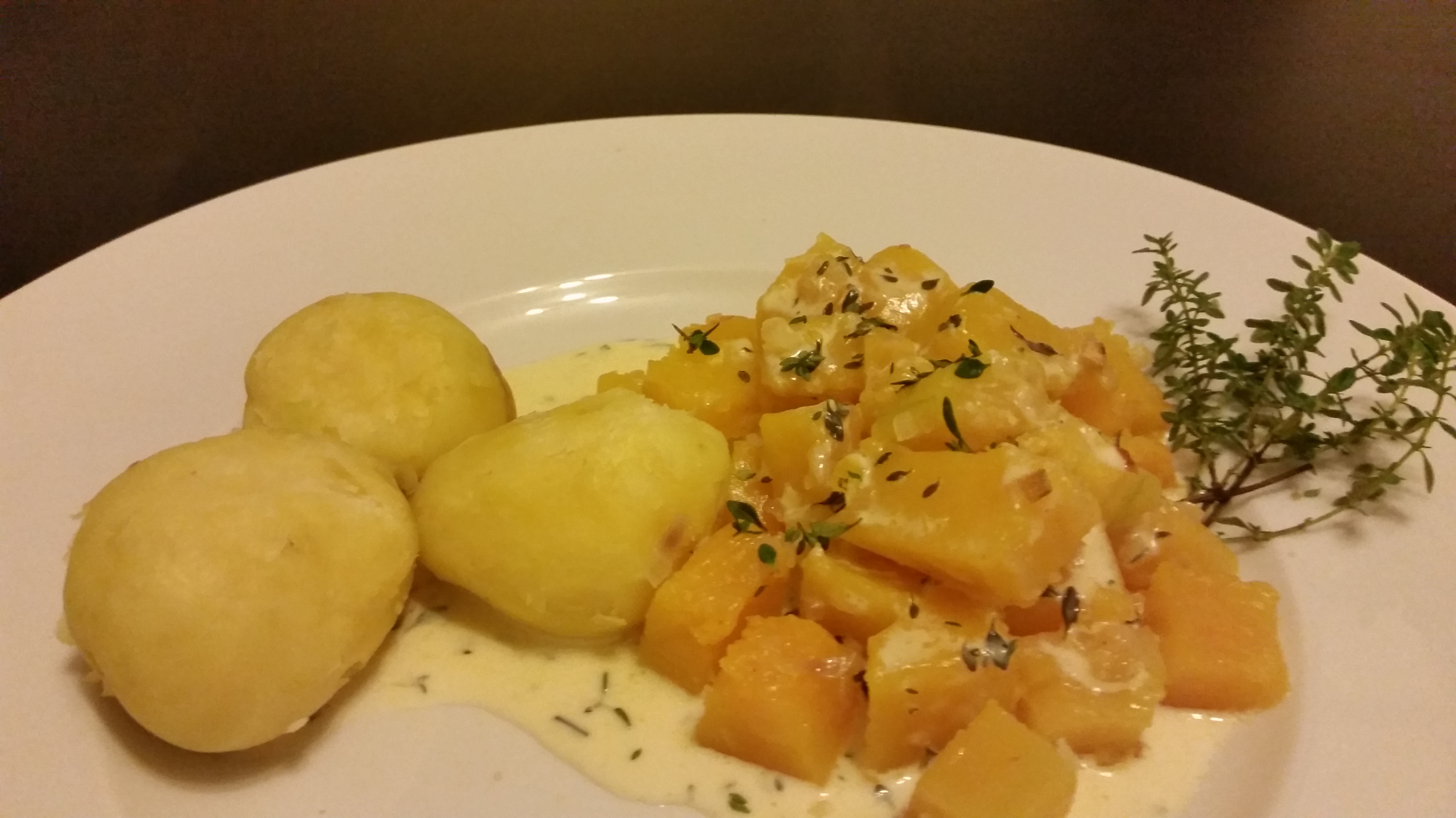 Butternut in einer Thymian-Sahne-Soße. Dieses Rezept habe ich beim Kauf von einer netten Marktfrau gleich mündlich mitbekommen – und es war sehr lecker!