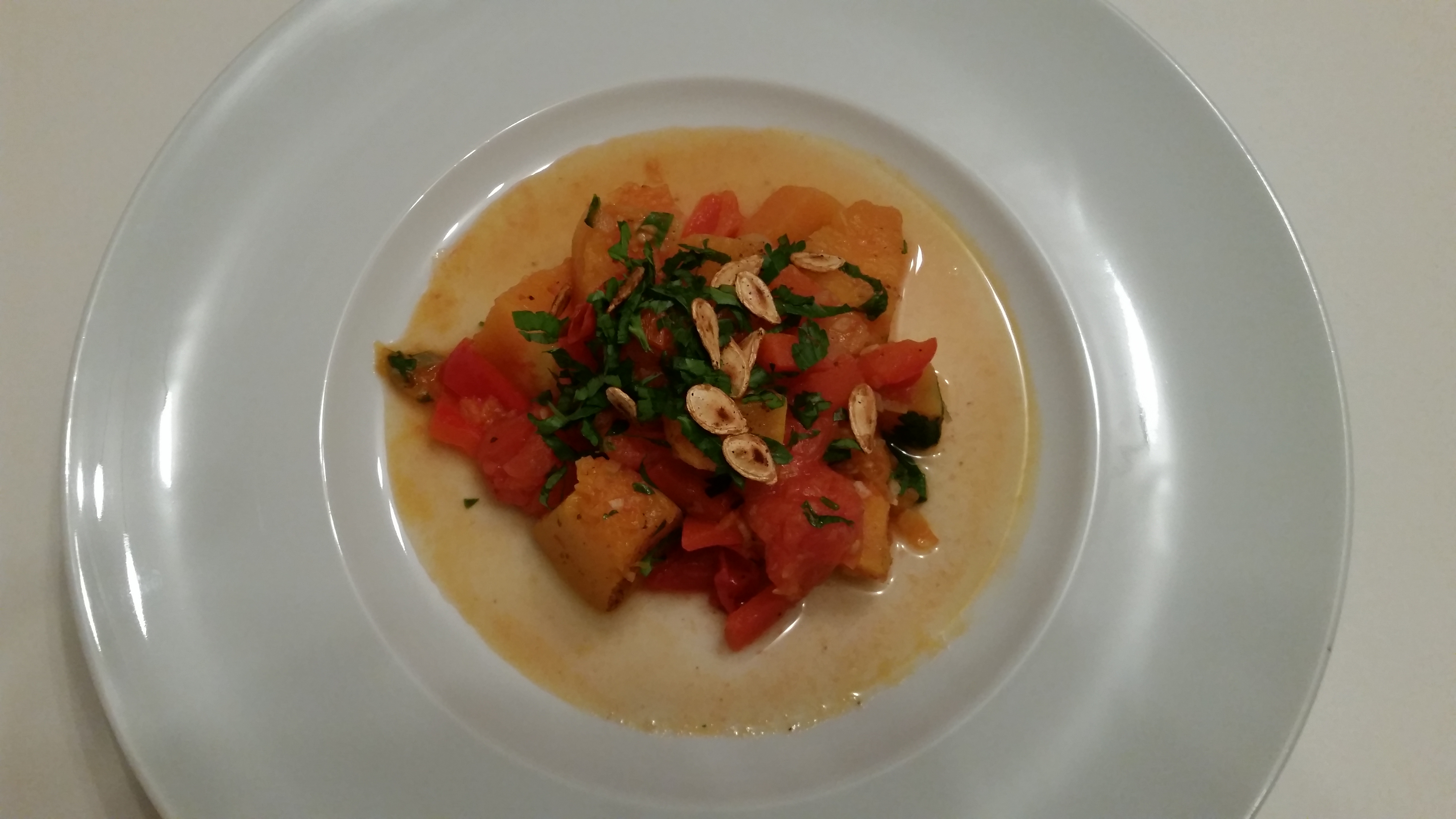 Die Zutaten bestehen aus Muskatkürbis, Tomaten, Paprika, Zwiebeln und der besondere Clou – Minze. Nana-Minze, die ich besonders liebe – sie wächst auf meiner kleinen Terrasse – durfte den Kürbis begleiten und ihn zu einem ganz besonderen Geschmackserlebnis verhelfen.