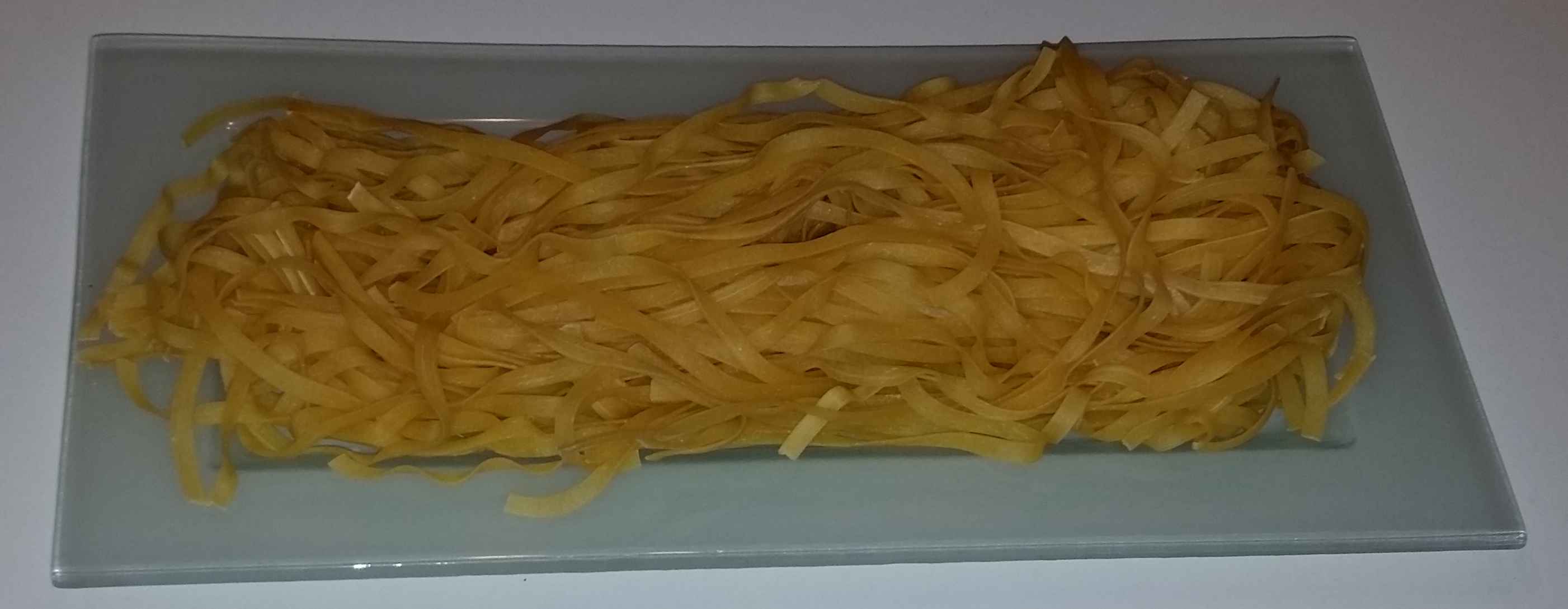 9:30 Fertige Tagliatelle erreichen aus Beates Nudelmaschine meine Küche und werden mit Aaah und Oooh – wie lecker – bewundert