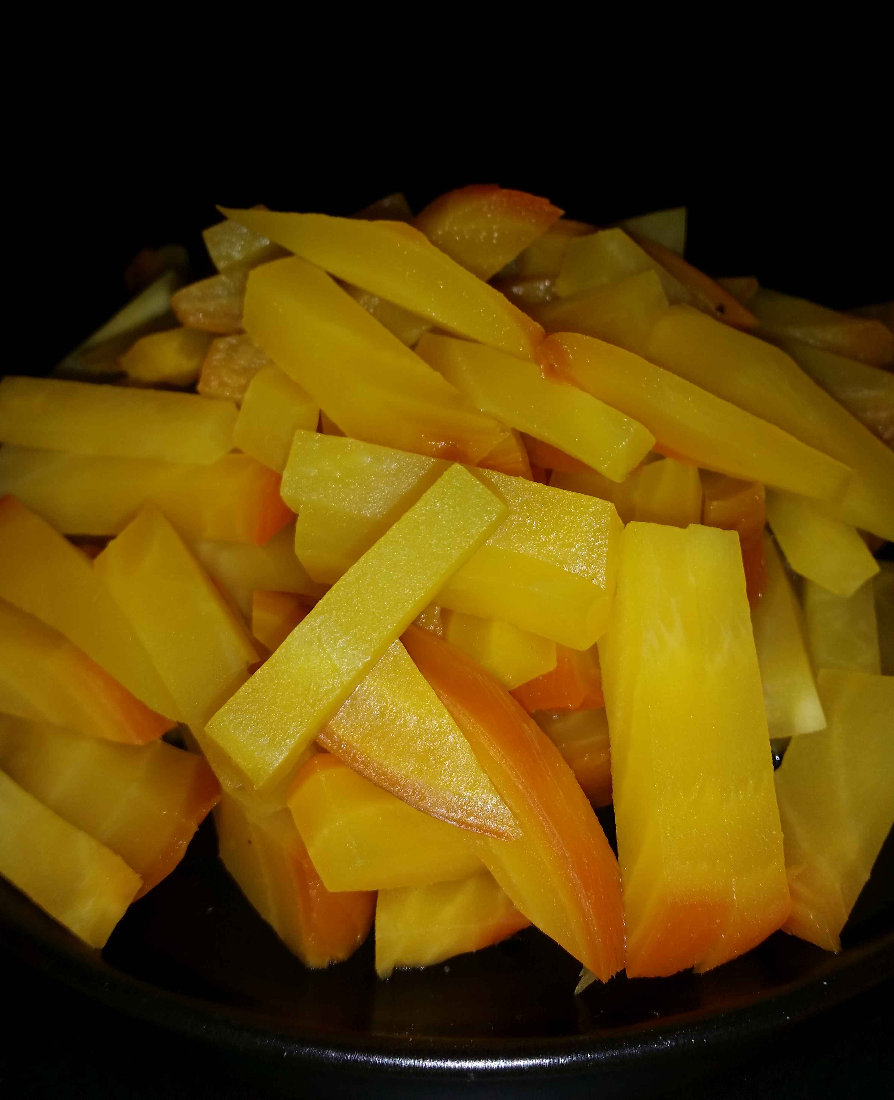 Feingehackte Zwiebeln leicht in Butter anbraten, die Ringelbete-Stifte dazugeben und mitbraten,