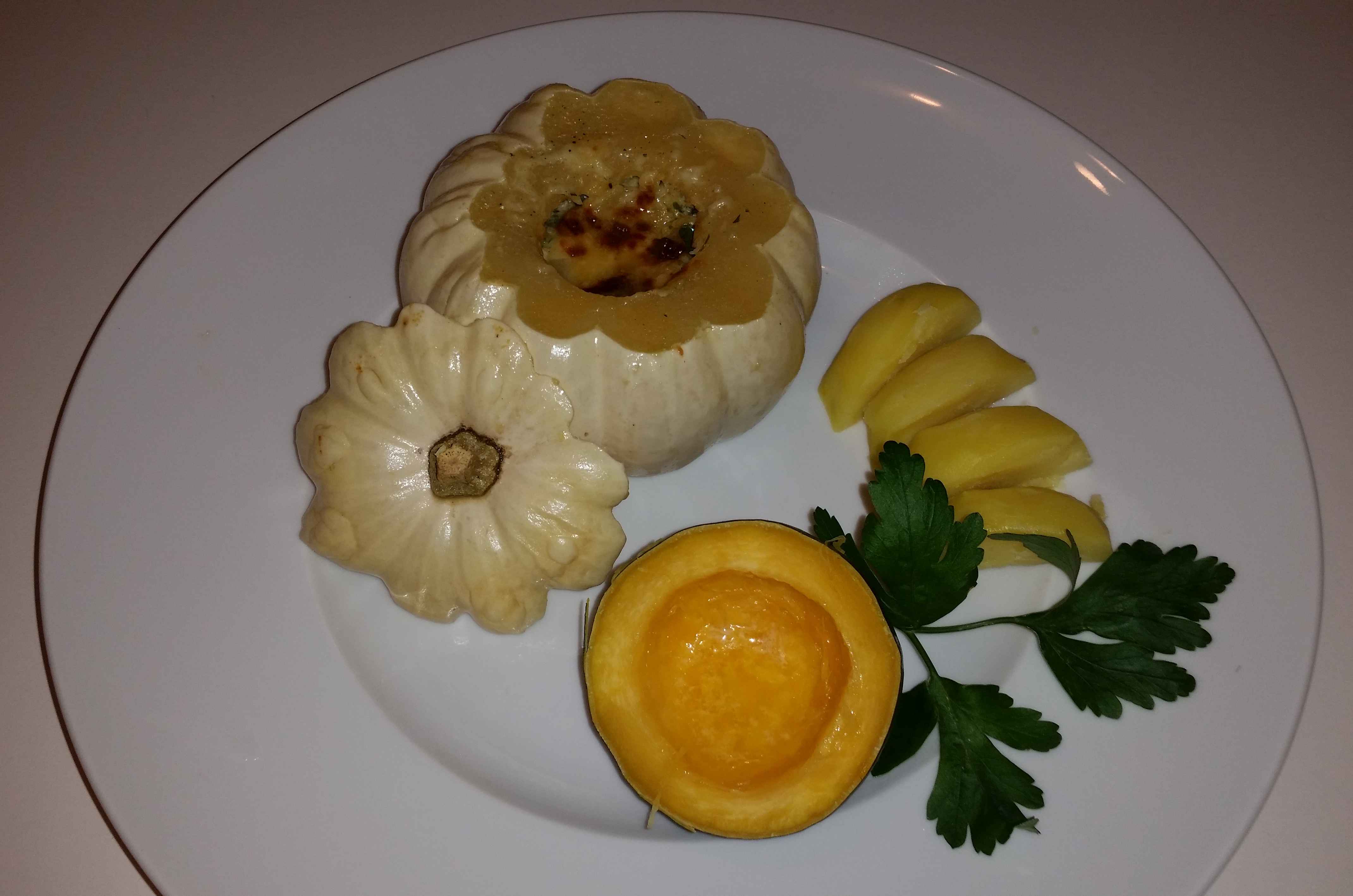 Der Rondini (der süße kleine…) wird im Ganzen in Salzwasser gegart, dann halbiert, die Kerne entfernt, gesalzen und in die heißen Kürbishälften Butterflocken hineingeben. Nun wird er einfach nur ausgelöffelt (und das gerne – im Gegensatz zu mancher Suppe!!) Ein ganz wunderbares Aroma!