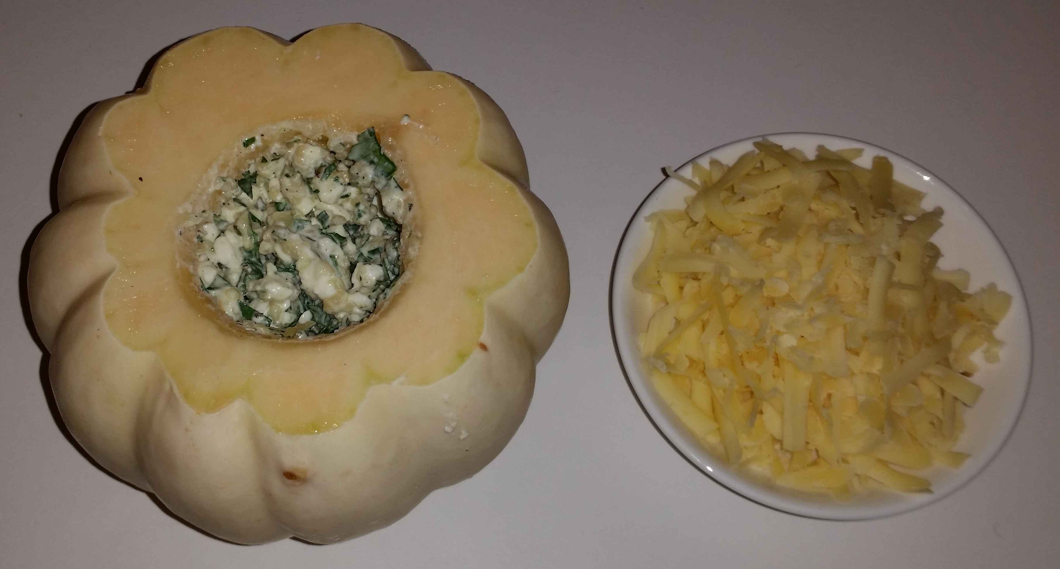 Der Mikrowellenkürbis – irgendwie ein ziemlich technischer Name für ein solch edles Gewächs – wird gefüllt. Dazu wird ein „Deckel“ weggeschnitten, das Innere von den Kernen und Fasern befreit. Für die Füllung habe ich Frischkäse, Petersilie, Salz, Pfeffer, etwas Chili und Hanfsamen verwendet.