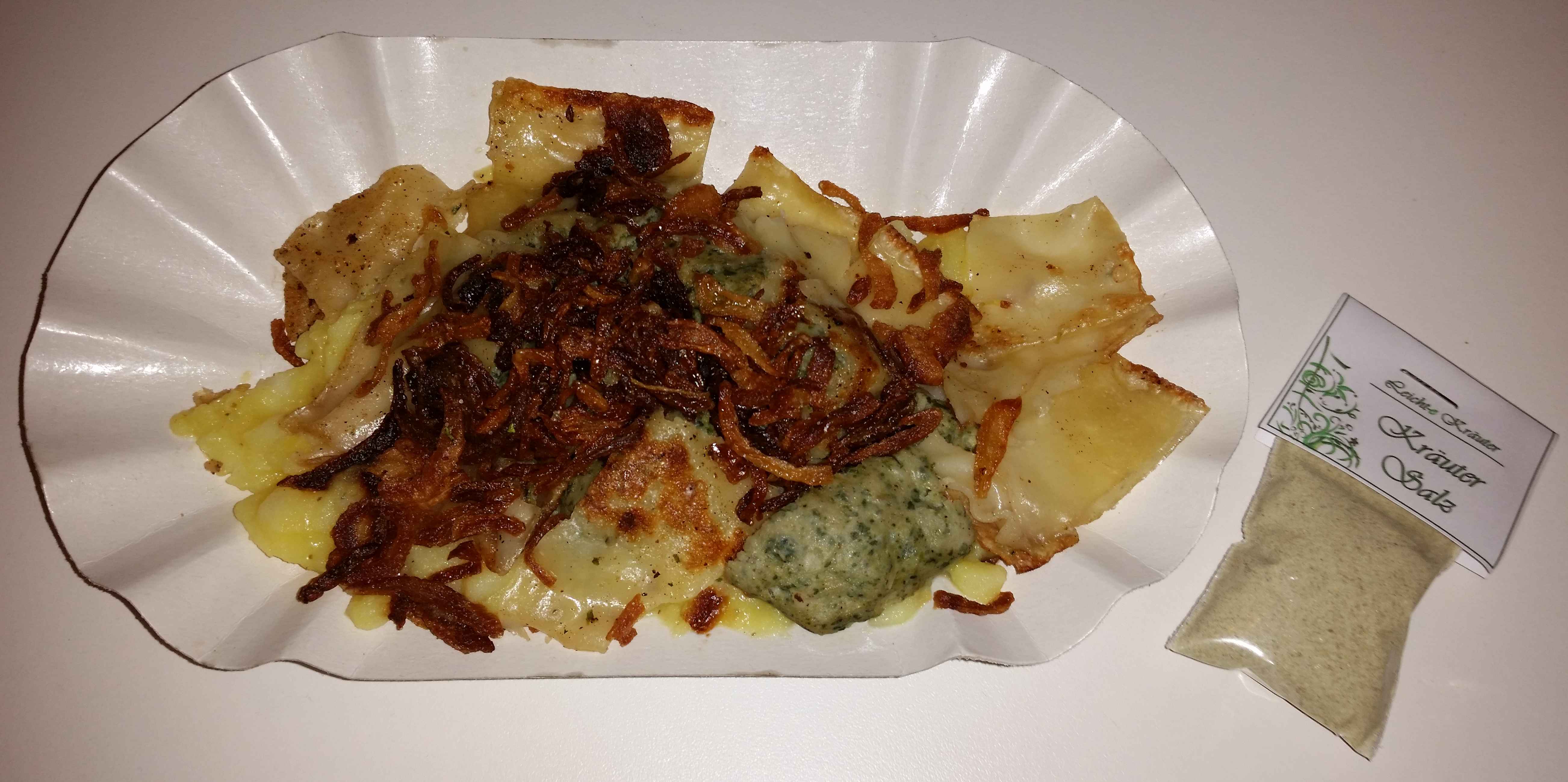 Lucia Leicht, die Betreiberin des Dorflädles in Iggingen verwöhnt uns mit selbstgemachten Maultaschen (Fleisch vom Biohof Fauser und Kräuter aus dem eigenen Garten, auch die Röstzwiebeln werden selbst hergestellt).