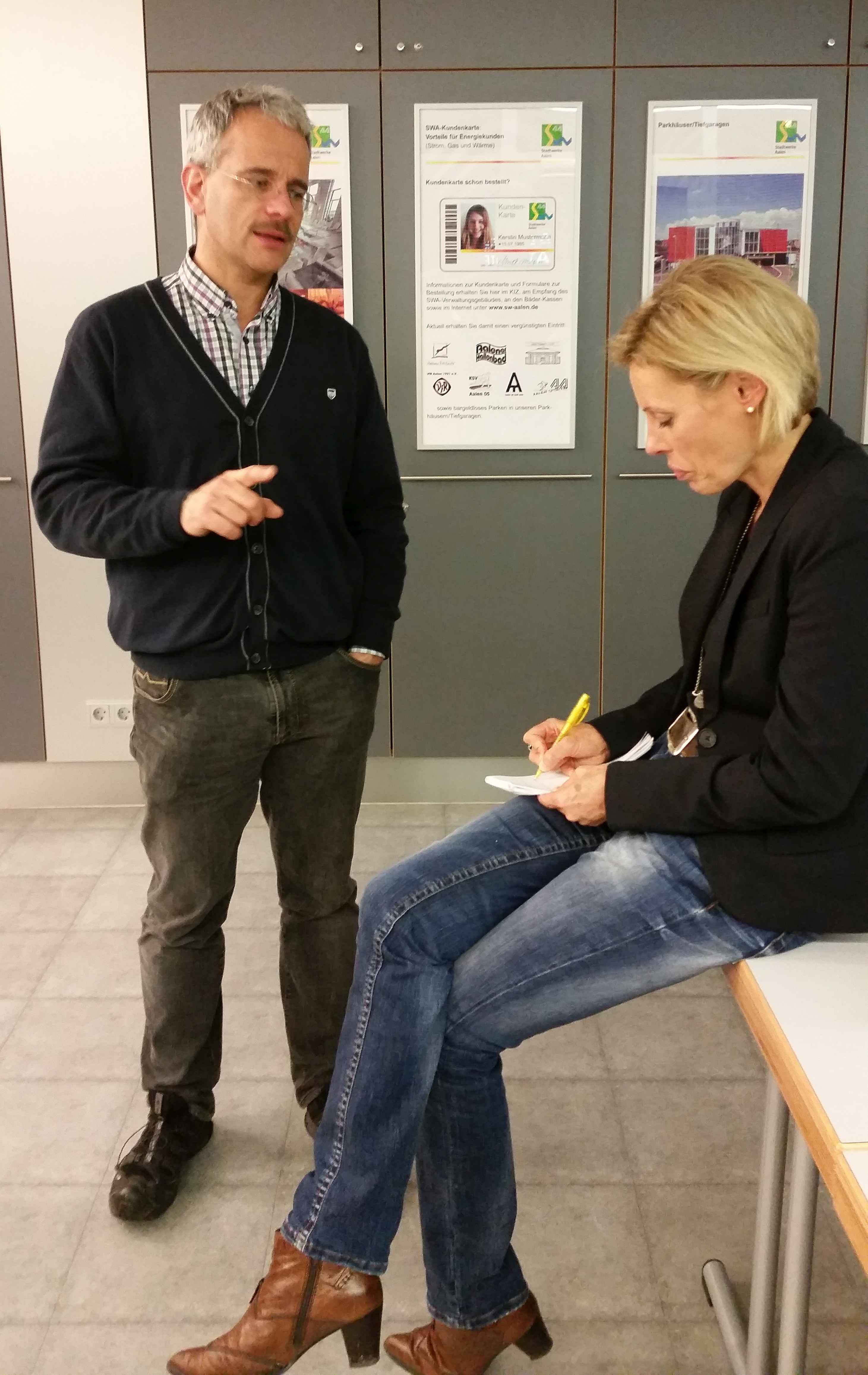 und Albrecht Barth, Eigentümer der Brauerei Aalener Löwenbräu und Mitinitiator, freut sich über die gelungene Aktion. Bereitwillig gibt er Ulrike Wilpert ein Interview für die Schwäpo.