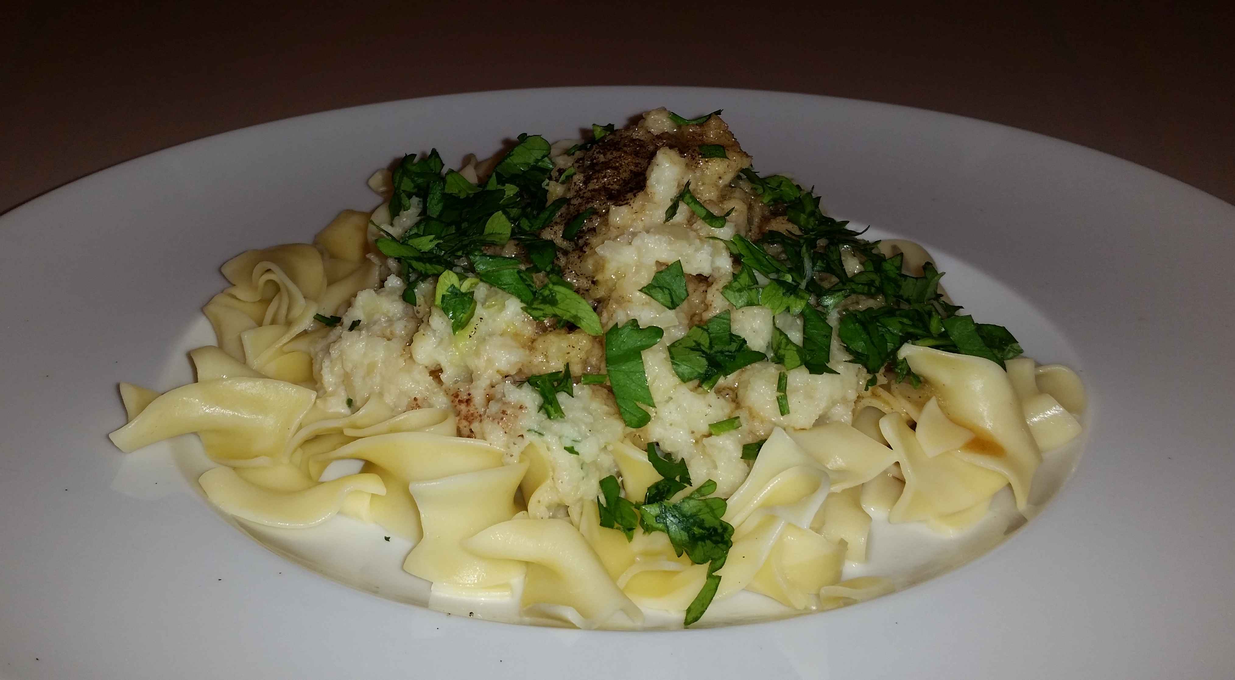 Eine leckere Variation als Püree auf Bandnudeln mit Petersilie und gebräunter Butter.