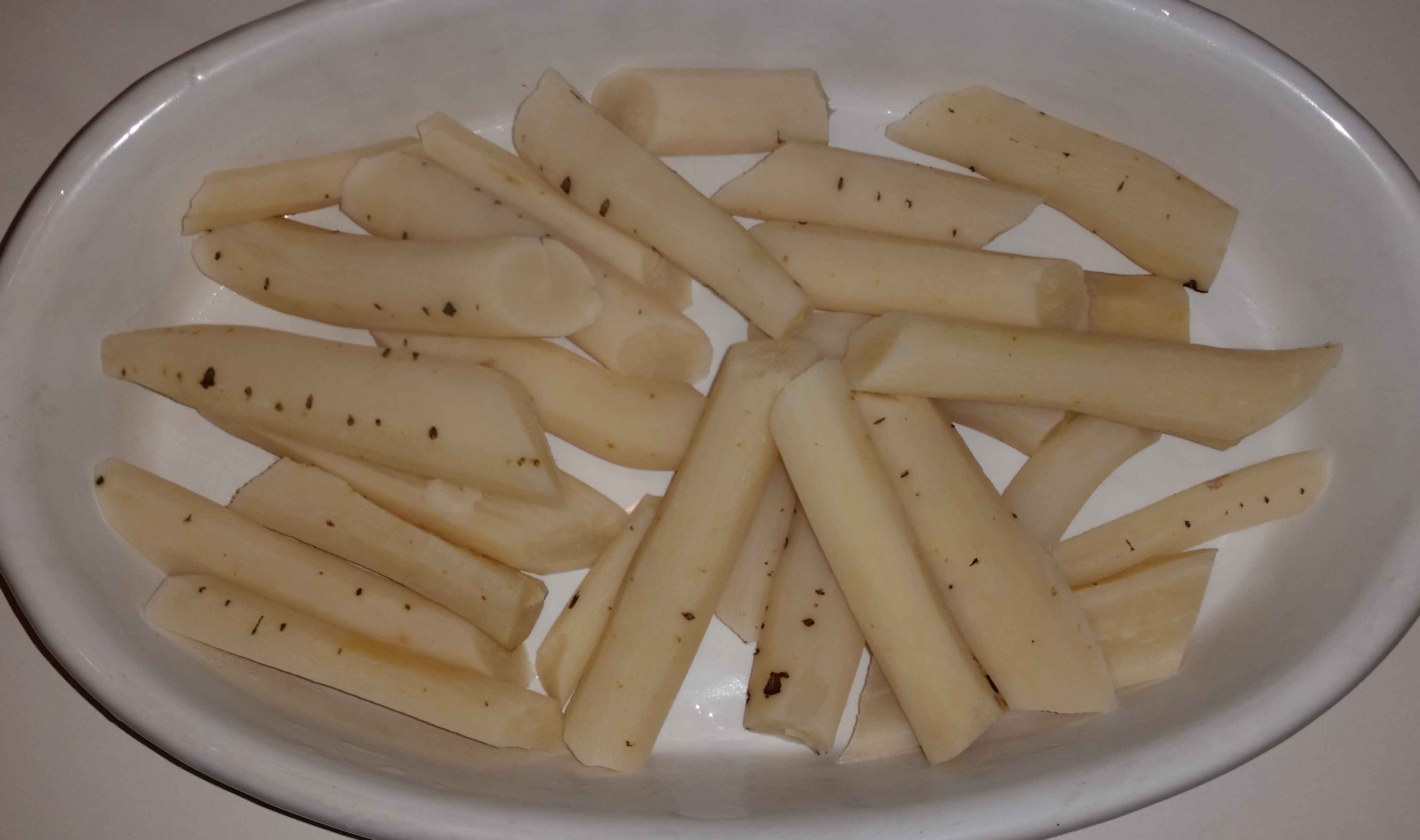 Was ich allerdings vergessen hatte, dass er und Julia mich auch „warnten“ vor dem milchigen Pflanzensaft, der beim Schälen austritt, wenn man die äußere Schicht verletzt… Ich kann nur sagen – Klebstoff ist nichts dagegen! Abwaschen nützt nicht viel. Erst wenn er so richtig auf der Haut angetrocknet ist, kann man ihn wegrubbeln. Also: immer mit Handschuhen und Schürze zur Tat schreiten!