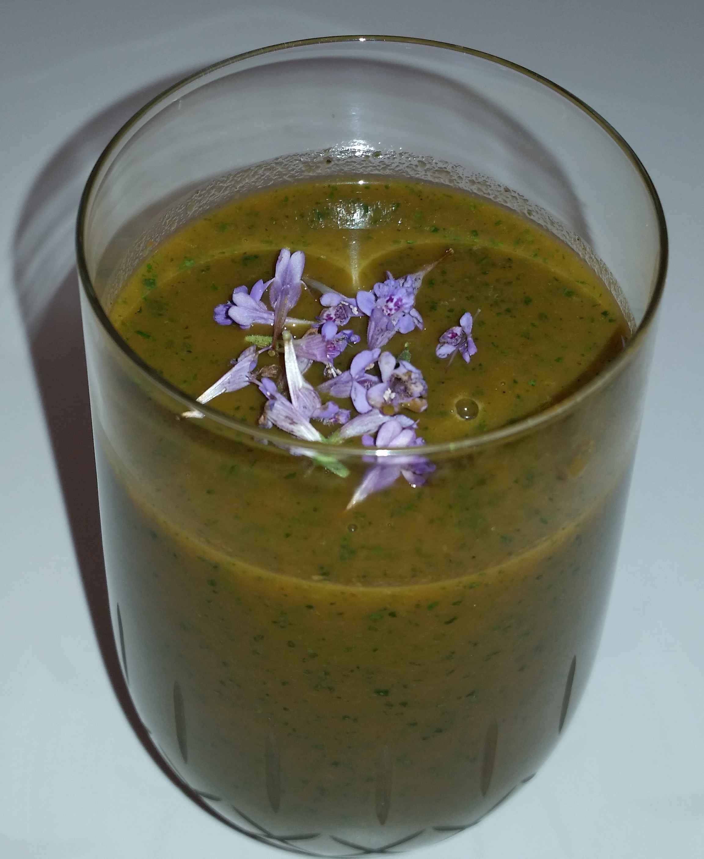 Alles wird nun fein püriert und mit etwas Wasser ergänzt bis es eine gute Trink-Konsistenz hat. In ein Glas gefüllt, dekoriert und dann man Prost! Auf ein langes Leben, Wohlergehen!