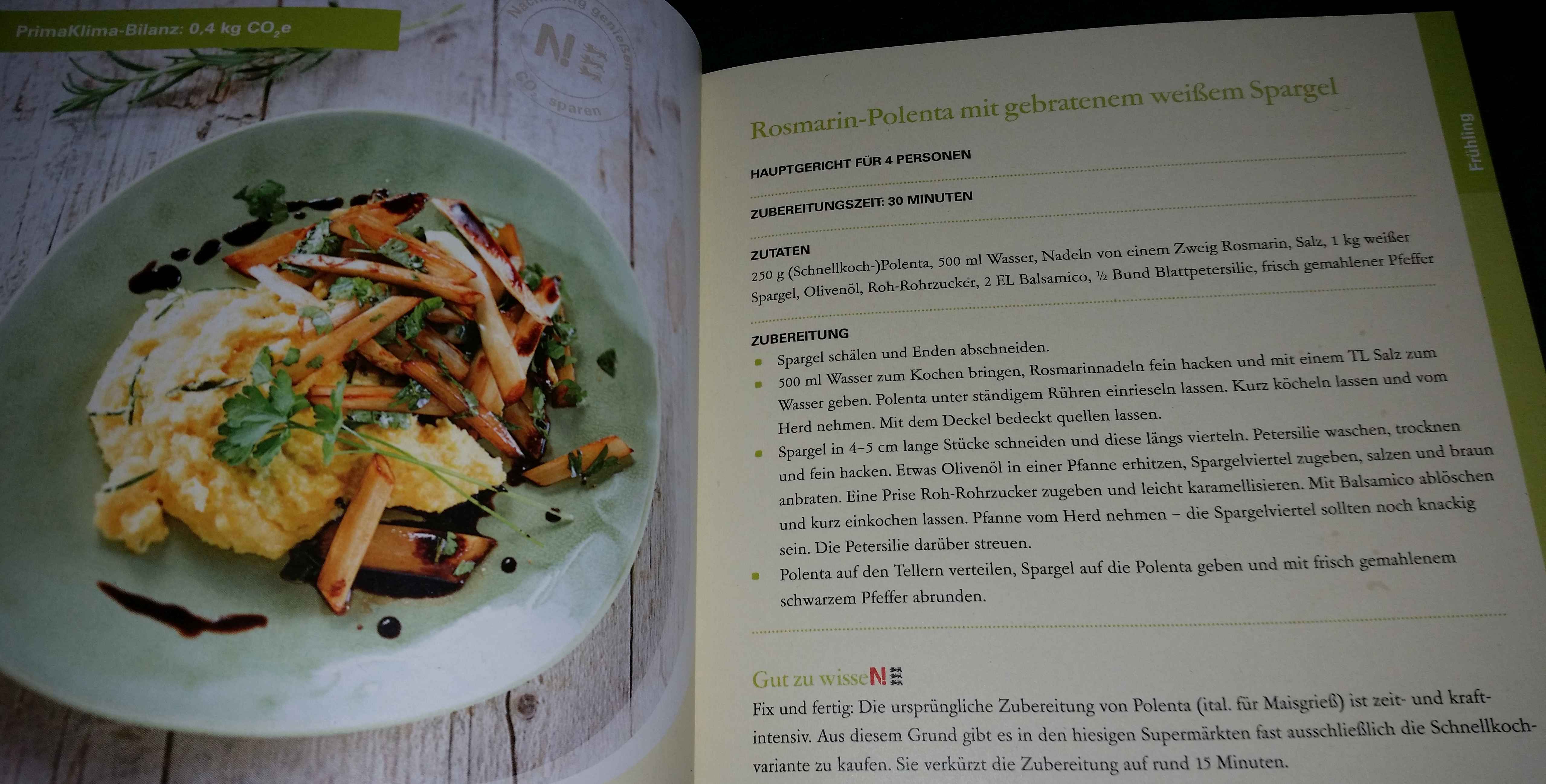 Das Rezept besteht aus Polenta mit Rosmarin (von mir ergänzt mit Zitronenschale) und gebratenem Spargel in einer Balsamico-Sauce.