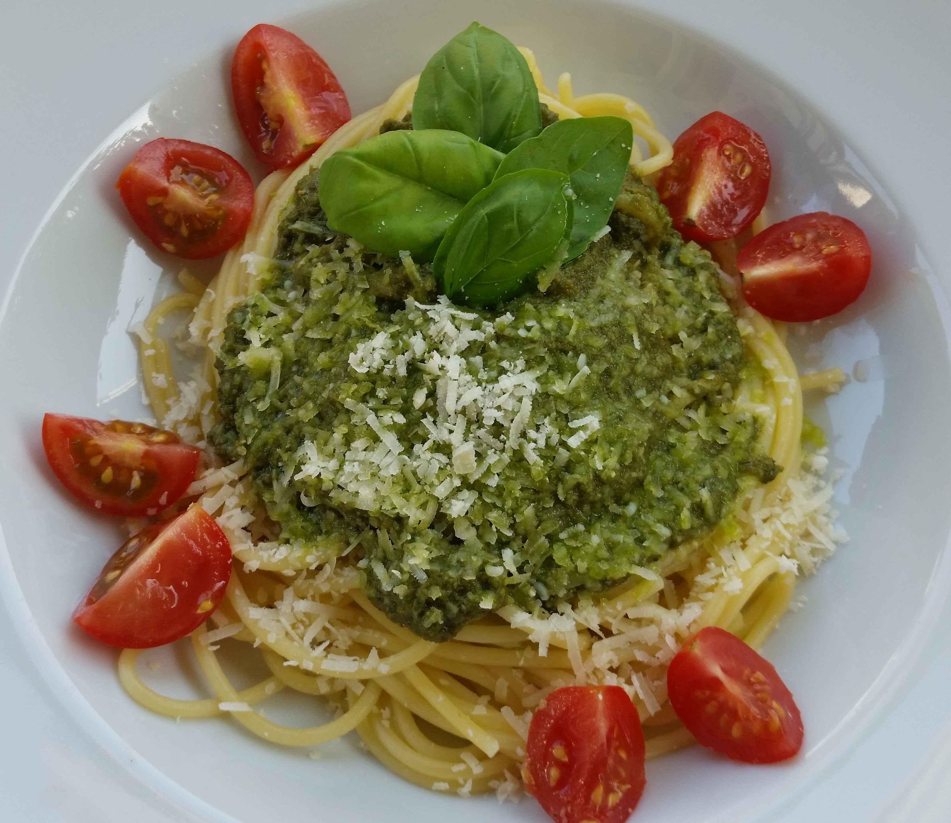 Basilikum, Olivenöl, Zitrone (hier verwerte ich die kleinen Zitronenansätze, die partout nicht zur Zitrone heranwachsen wollen und von meinem Bäumchen fallen, aber in sich schon den ganzen Duft der Zitrone tragen), geriebener Parmesan, Knoblauch, geröstete Pinien- oder Sonnenblumenkerne, etwas Salz und Pfeffer werden mit dem Pürierstab zerkleinert und fertig ist ein frisches, richtig schmackhaftes Pesto. Die Mengen stelle ich ganz nach Gefühl zusammen. Das klappt immer.