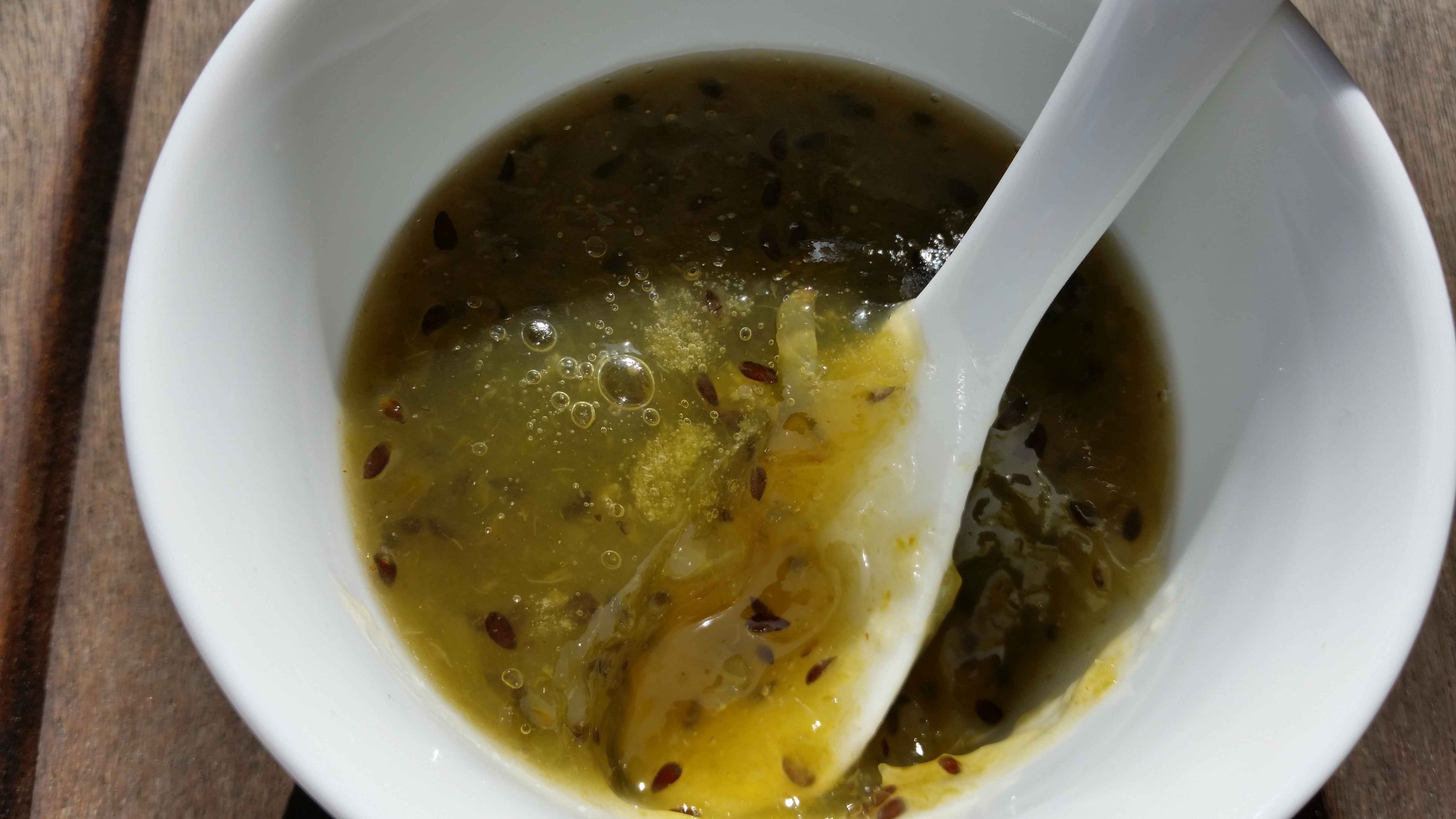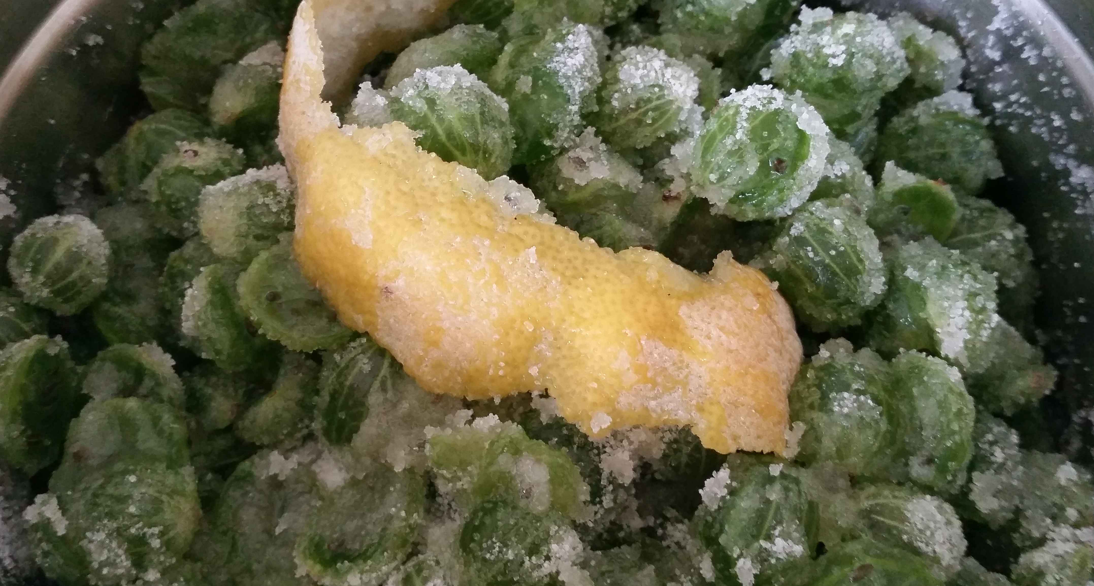 Die Früchte werden nach dem Putzen halbiert, mit 500 g Gelierzucker 1:2 verrührt – bei mir gab es noch eine Zitronenschale meiner im Moment letzten reifen Zitrone – und ungefähr 2 Stunden im Topf ziehen lassen.