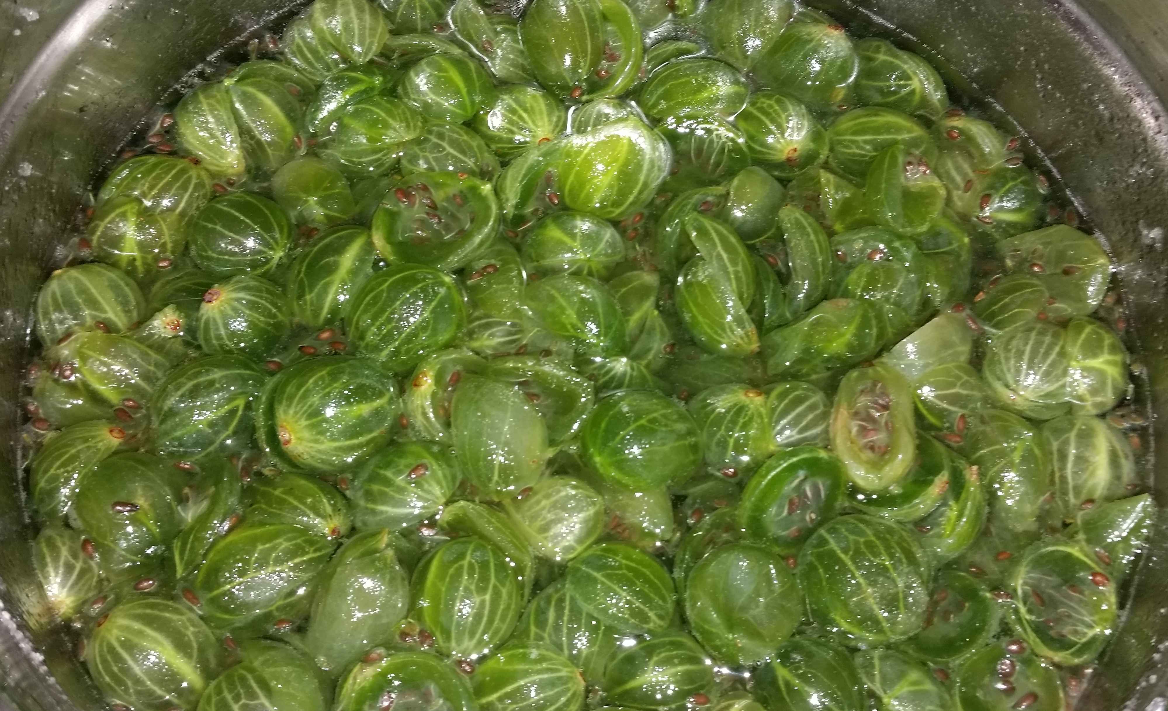 Mit der Marmelade aus Stachelbeeren verbinde ich wunderbare Erinnerungen an meine Kindheit, wo ich die Wochenenden auf der Schwäbischen Alb verbrachte bei einer befreundeten Bauernfamilie, den Schmelchers aus Dapfen. Hier konnte ich meine Liebe zur Landwirtschaft und den Kühen so richtig ausleben: Morgens um 5 Uhr in den Stall, Rüben häckseln, Kühe füttern und beim Melken helfen (und sei es auch nur durch Graulen der Kühe zwischen den Hörner – damals gab es das noch: Kühe mit Hörnern. Sie genossen es immer sehr!). Nach der Stallarbeit gab es ein deftiges Frühstück. Mir genügte allerdings ein frisches Bauernbrot. Das wurde damals im Backhaus des Ortes von den Bäuerinnen gebacken – auch eine Erinnerung, die ich mir bewahrt habe. Dazu gab es Kakao und das Brot war mit selbstgemachter Butter (ein Geschmack, dem ich heute noch immer „nachlaufe“ und nicht wieder gefunden habe) und für mich als Krönung: Stachelbeer-Marmelade.