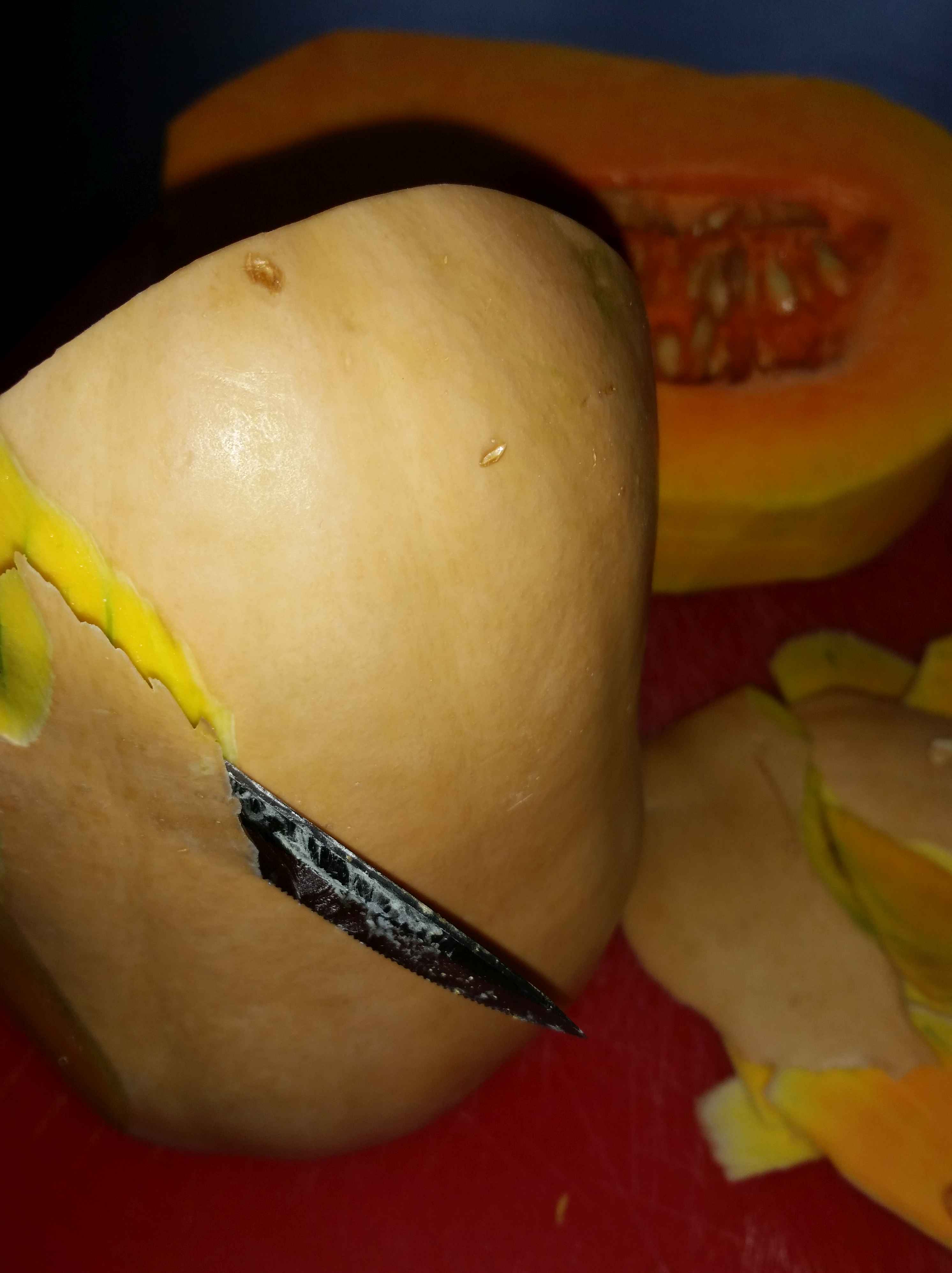 Da der Butternut zwar handlich aussah, aber viel ausgab, habe ich nur die Hälfte für dieses Gericht zubereitet. Die andere Hälfte wird zu Püree oder Suppe verarbeitet werden.