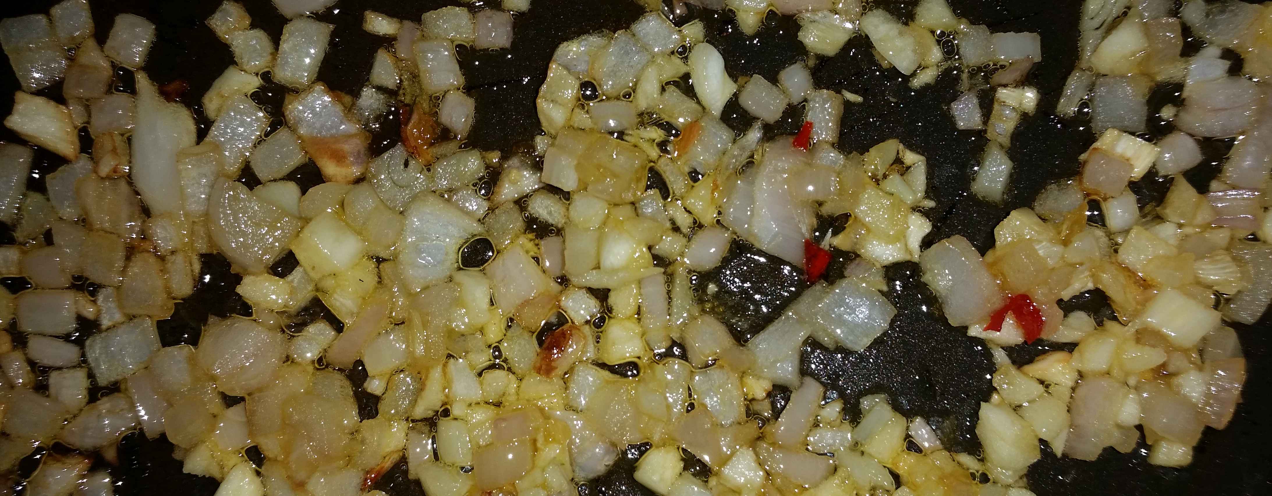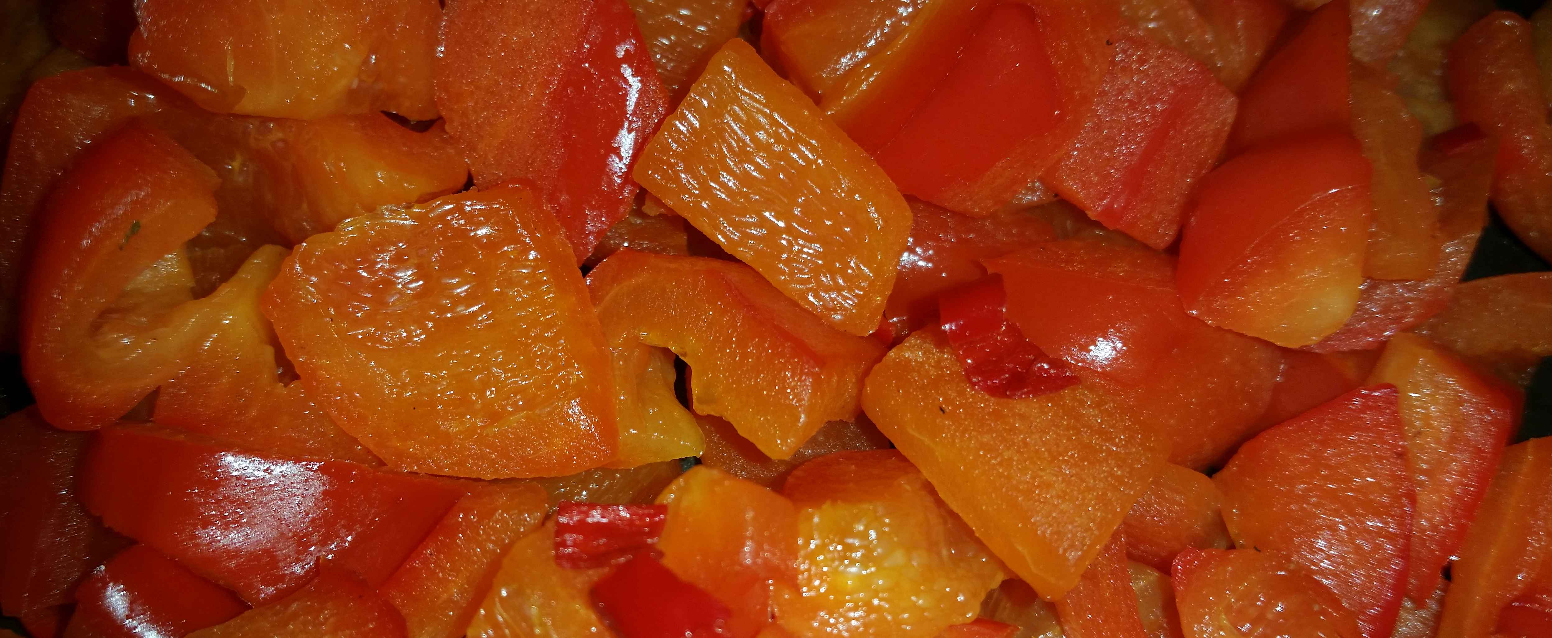 Für die Paprika werden zuerst die Schalotte und die Knoblauchzehe fein gehackt und angebraten. Dann wird die Paprika geschält, von Kernen und Scheidewänden befreit und in kleine Stücke geschnitten. Zusammen mit den Zwiebeln gar werden lassen.