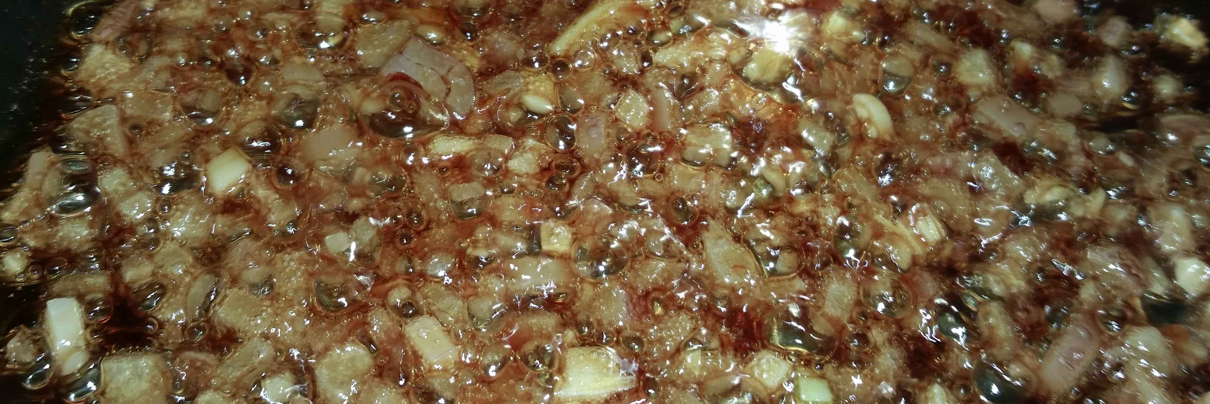 Für das Mus oder Püree habe ich Schalotten und Knoblauch fein geschnitten und in Raps- und Kürbiskernöl goldgelb gebraten.