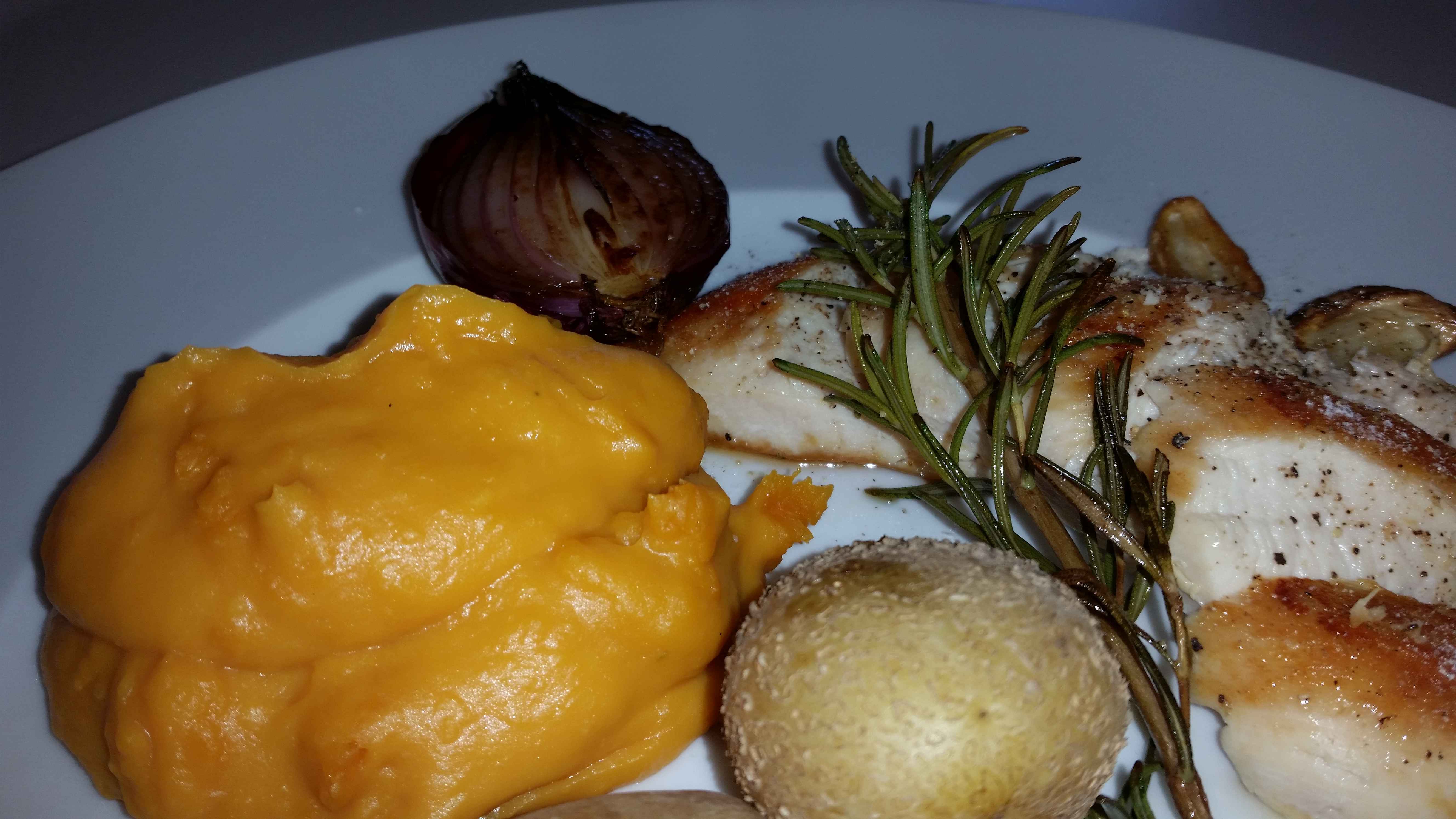 Das Kürbis-Püree ist so lecker, dass ich mich zügeln musste, um noch etwas auf die Teller zu bringen!