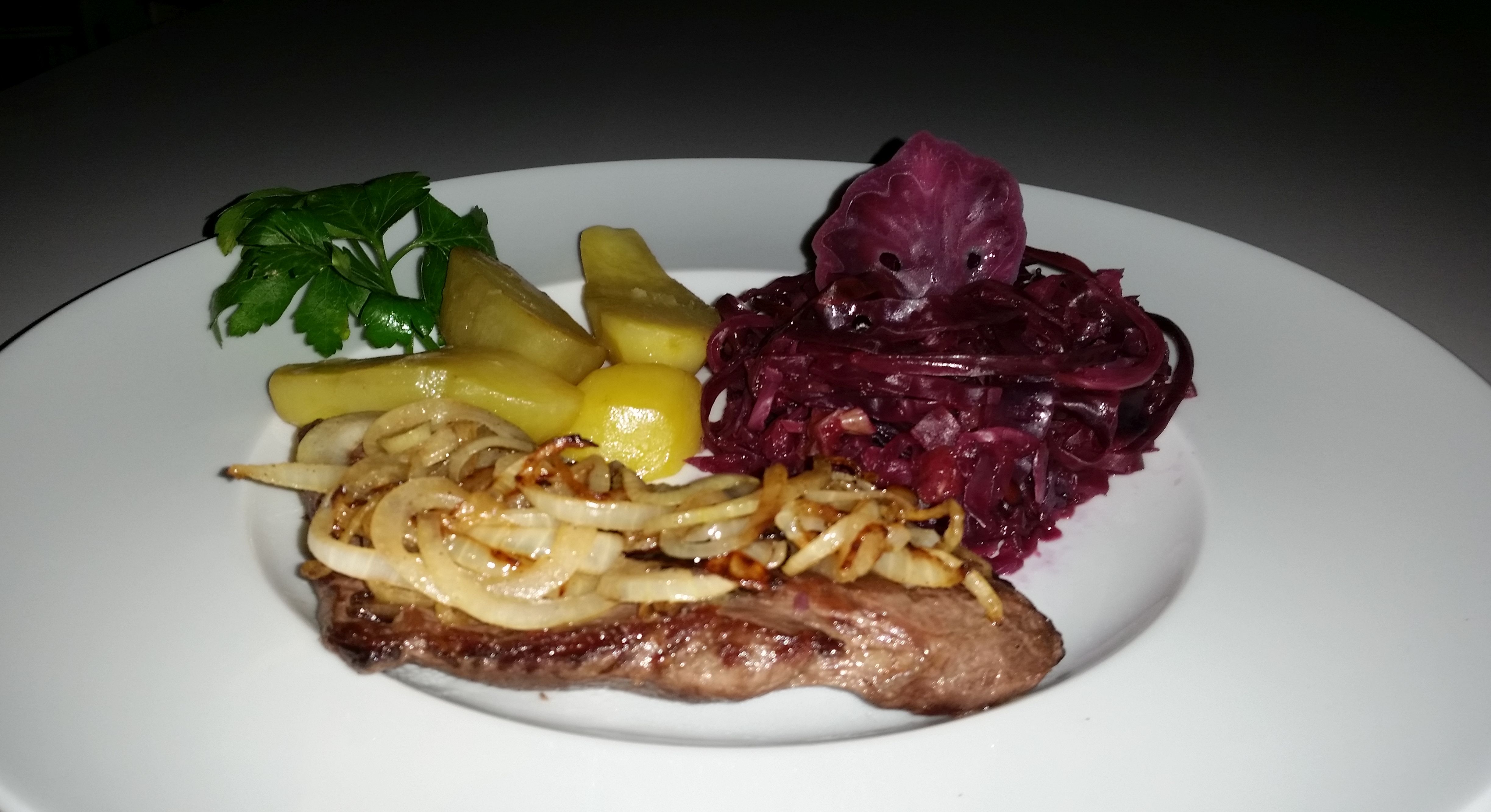 Dazu habe ich Kartoffelschnitze gemacht und ein wunderbares Zwiebel-Rostbrätle vom Ostalb-Rind.