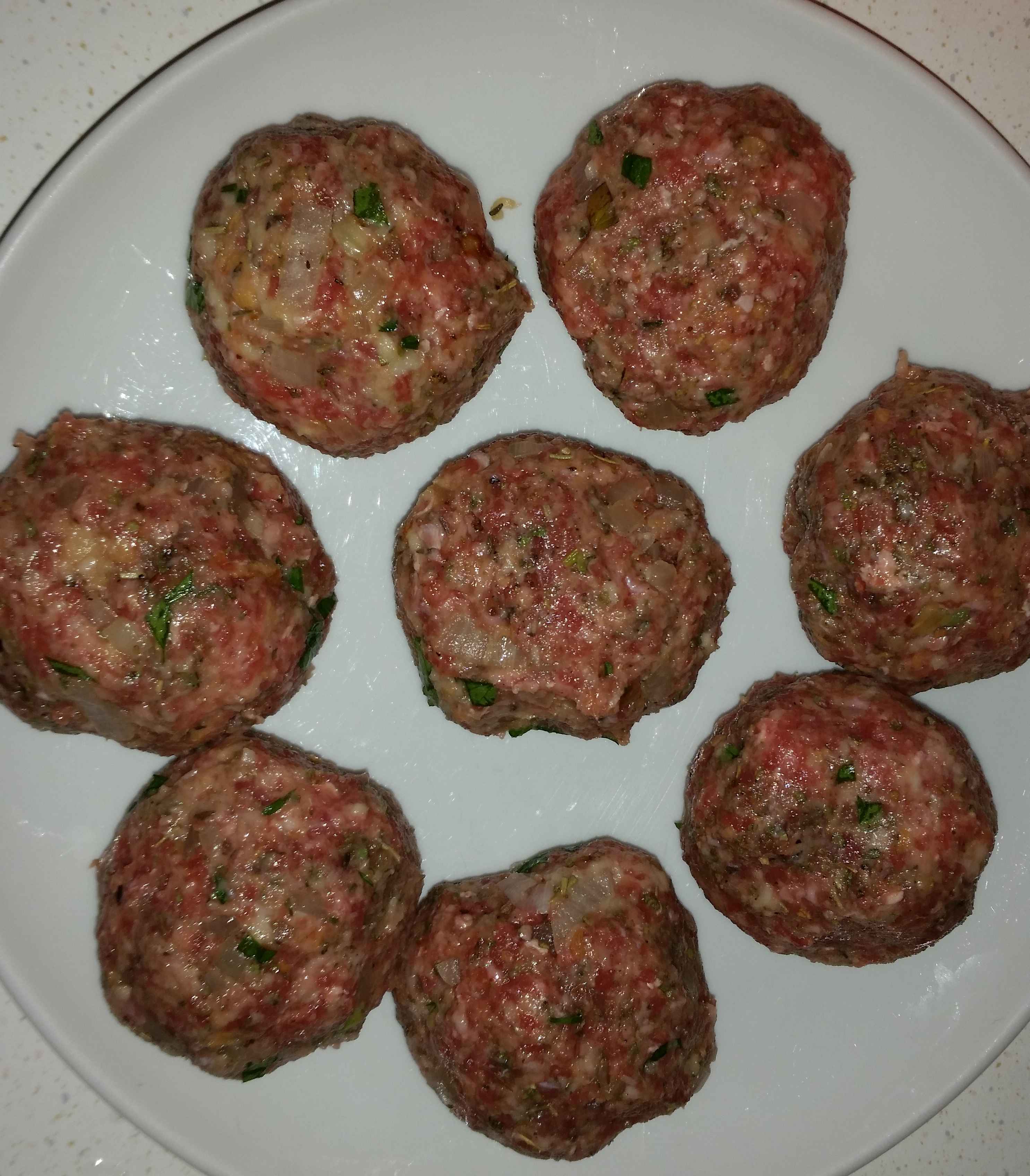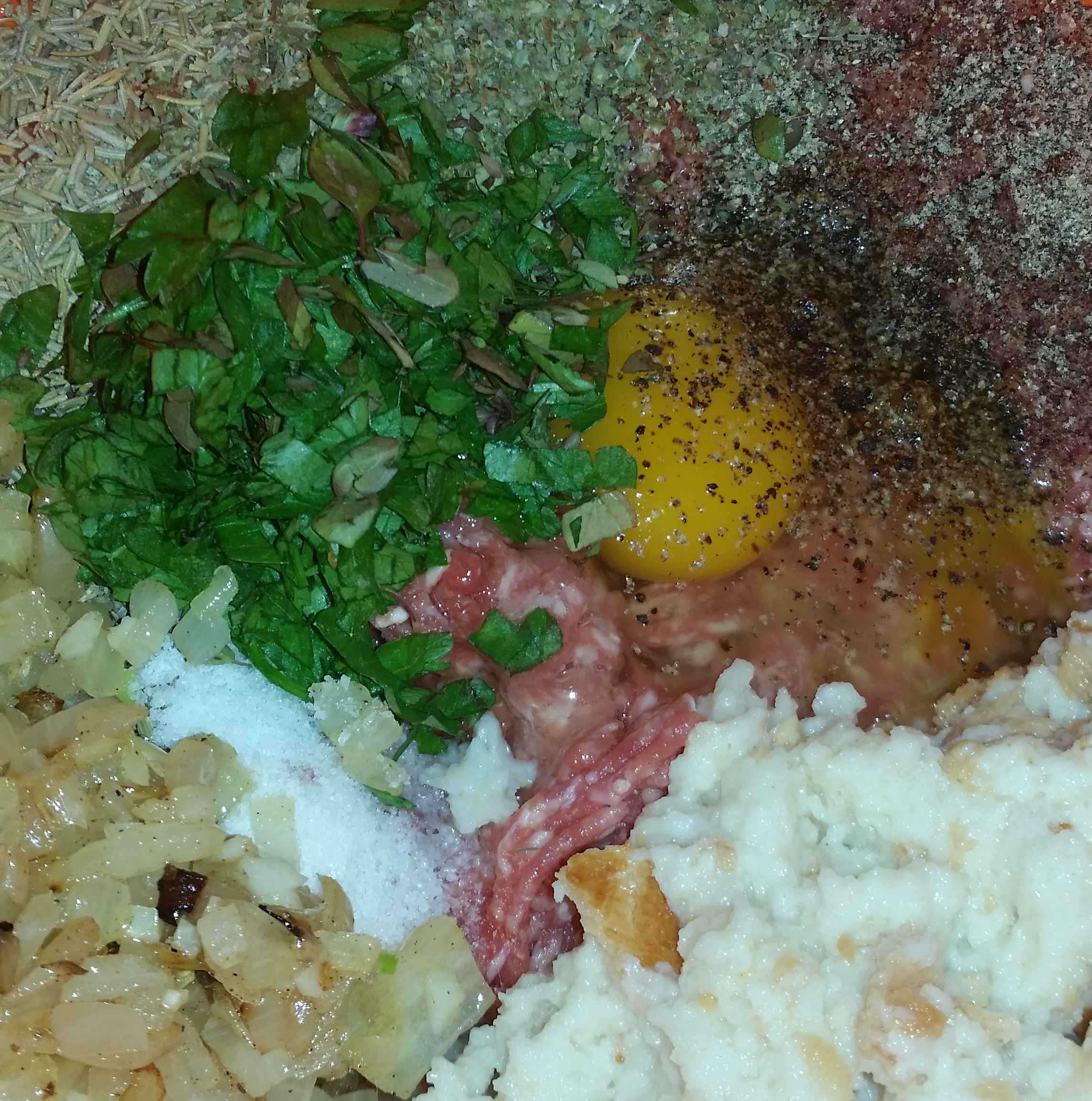 Meine Königsberger Klopse werden aus Bio-Rinderhack gemacht. Dazu ein eingeweichtes Brötchen für die Fluffigkeit, ein Freiland-Ei, Kräuter (Rosmarin, Thymian, Majoran, Petersilie), geschmälzte Zwiebeln und Knoblauch, Salz, Pfeffer und ein wenig Muskat.