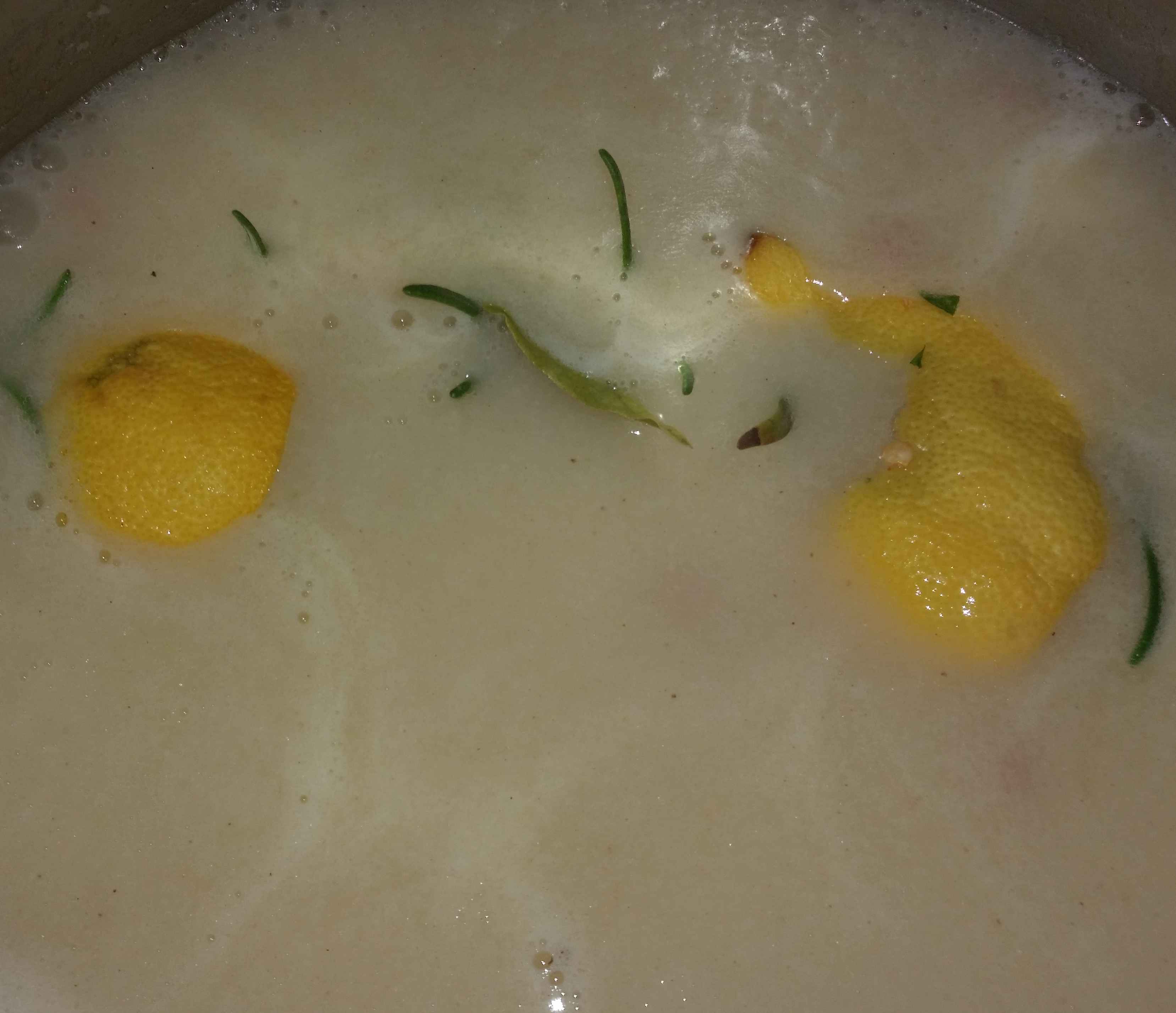 In der Sauce köcheln Zitronenschalen und ein paar Kapern mit. Zitronensaft kommt erst hinzu, wenn die Klopse fertig sind.